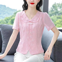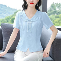 2025夏季新款新中式短袖提花襯衫,娃娃領減齡顯年輕,短版小衫顯高顯比例,時尚百搭